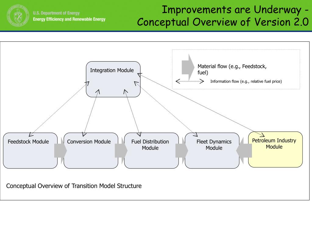 Improvements are Underway - Conceptual Overview of Version 2.0 Material flow (e.g., Feedstock, fuel) Integration Module Information flow (e.g., relative fuel price) Petroleum Industry Module Feedstock Module Conversion Module Fuel Distribution Module Fleet Dynamics Module Conceptual Overview of Transition Model Structure
