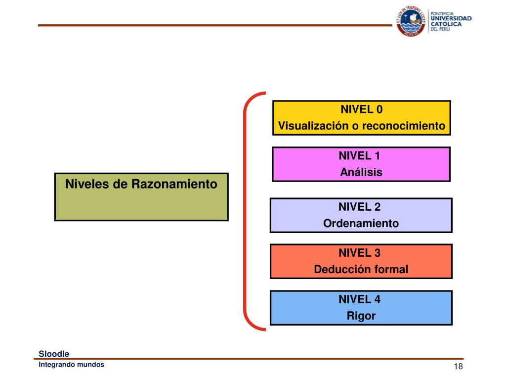 NIVEL 0 Visualización o reconocimiento NIVEL 1 Análisis Niveles de Razonamiento NIVEL 2 Ordenamiento NIVEL 3 Deducción formal NIVEL 4 Rigor