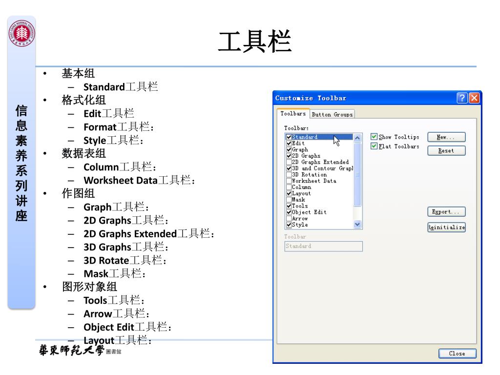 工具栏 • 基本组 • Standard工具栏 • 格式化组 • Edit工具栏 • Format工具栏: • Style工具栏: • 数据表组 • Column工具栏: • Worksheet Data工具栏: • 作图组 • Graph工具栏: • 2D Graphs工具栏: • 2D Graphs Extended工具栏: • 3D Graphs工具栏: • 3D Rotate工具栏: • Mask工具栏: • 图形对象组 • Tools工具栏: • Arrow工具栏: • Object Edit工具栏: • Layout工具栏: