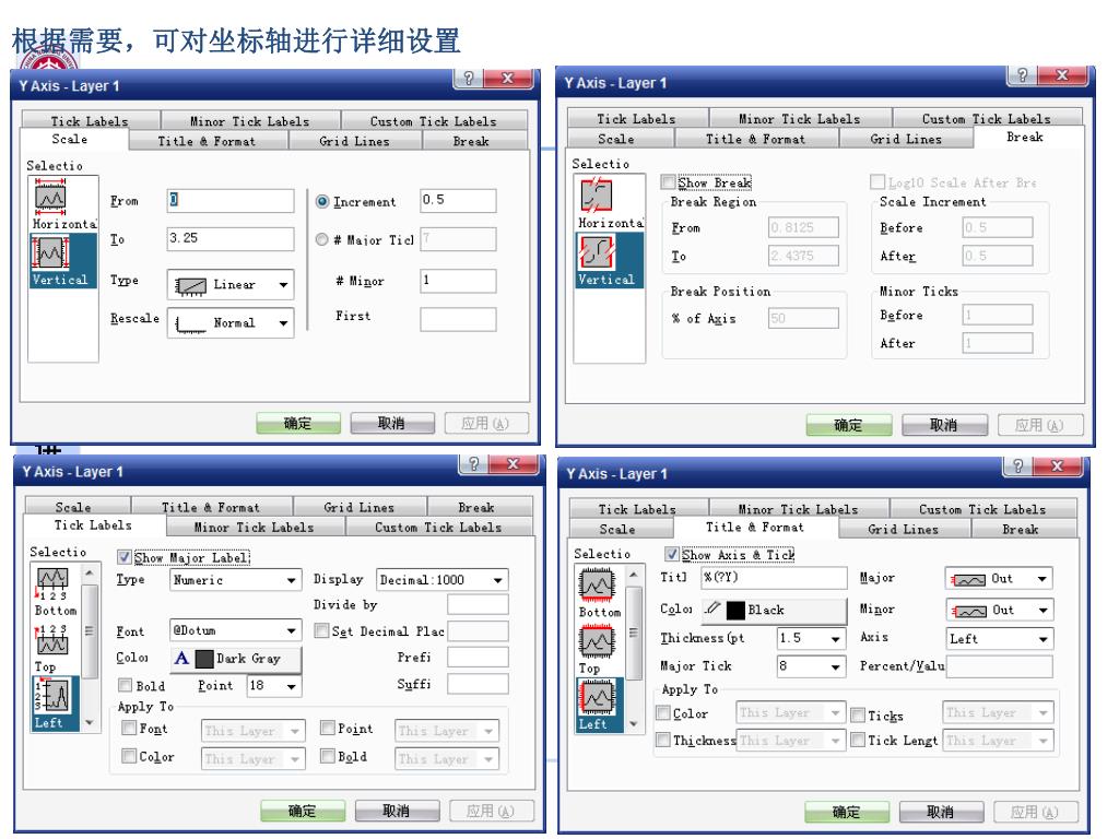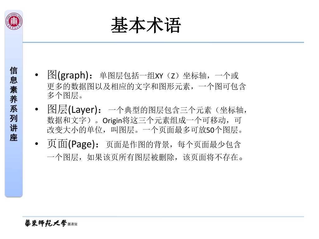 基本术语 • 图(graph):单图层包括一组XY(Z)坐标轴,一个或更多的数据图以及相应的文字和图形元素,一个图可包含多个图层。 • 图层(Layer):一个典型的图层包含三个元素(坐标轴,数据和文字)。Origin将这三个元素组成一个可移动,可改变大小的单位,叫图层。一个页面最多可放50个图层。 • 页面(Page):页面是作图的背景,每个页面最少包含一个图层,如果该页所有图层被删除,该页面将不存在。