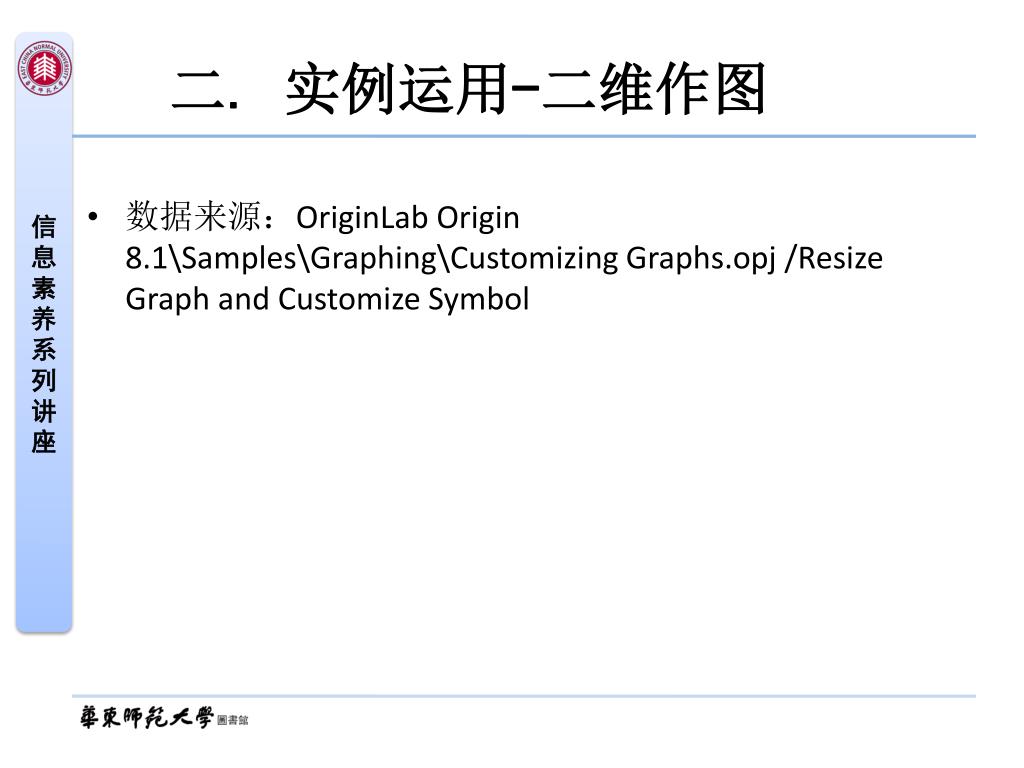 二. 实例运用-二维作图 • 数据来源:OriginLab Origin 8.1\Samples\Graphing\Customizing Graphs.opj /Resize Graph and Customize Symbol