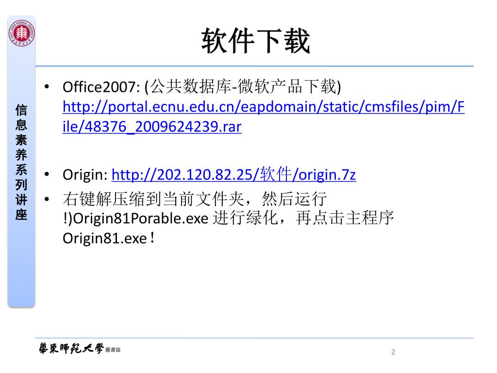 软件下载 • Office2007: (公共数据库-微软产品下载) http://portal.ecnu.edu.cn/eapdomain/static/cmsfiles/pim/File/48376_2009624239.rar • Origin: http://202.120.82.25/软件/origin.7z • 右键解压缩到当前文件夹,然后运行!)Origin81Porable.exe 进行绿化,再点击主程序 Origin81.exe!