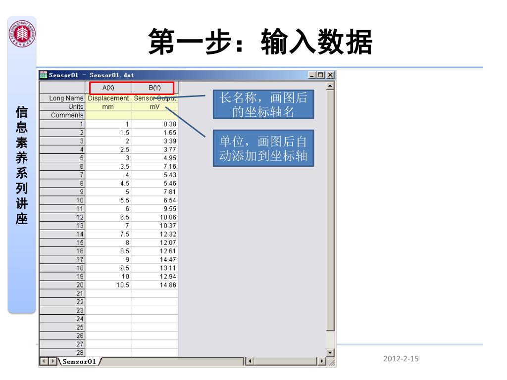第一步:输入数据 长名称,画图后的坐标轴名 单位,画图后自动添加到坐标轴 2012-2-15