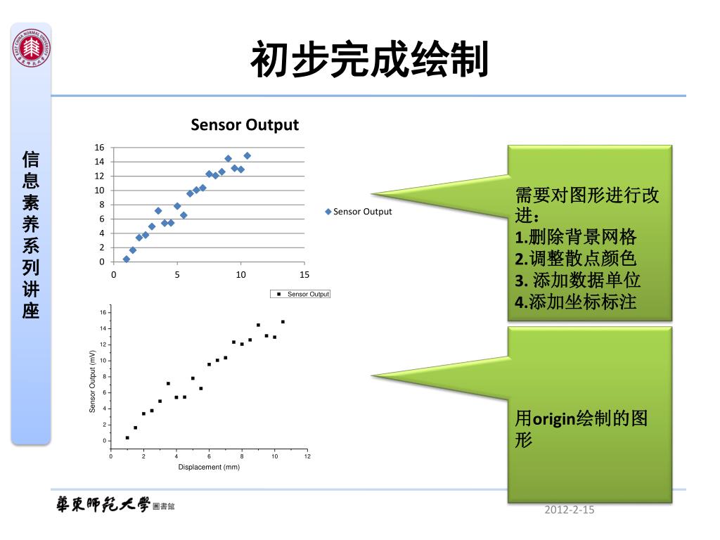 初步完成绘制 • 需要对图形进行改进: • 删除背景网格 • 调整散点颜色 • 添加数据单位 • 添加坐标标注 用origin绘制的图形 2012-2-15