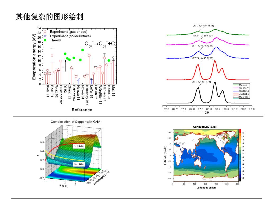 绘图功能比较 Origin8提供了12类绘图类型(60余种模板): Line(线型) symbol(符号) line+symbol(线型+符号) Columns/Bars(柱状/条状) Multi-Curve(多曲线) 3D XYY 3D XYZ 3D surface(3D表面图) Statistics(统计图) Area(面积图) Contour(等高线图) Specialized(其他特殊图)