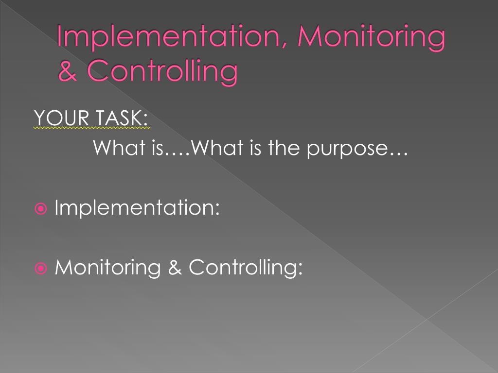 Implementation, Monitoring & Controlling YOUR TASK: What is….What is the purpose… • Implementation: • Monitoring & Controlling: