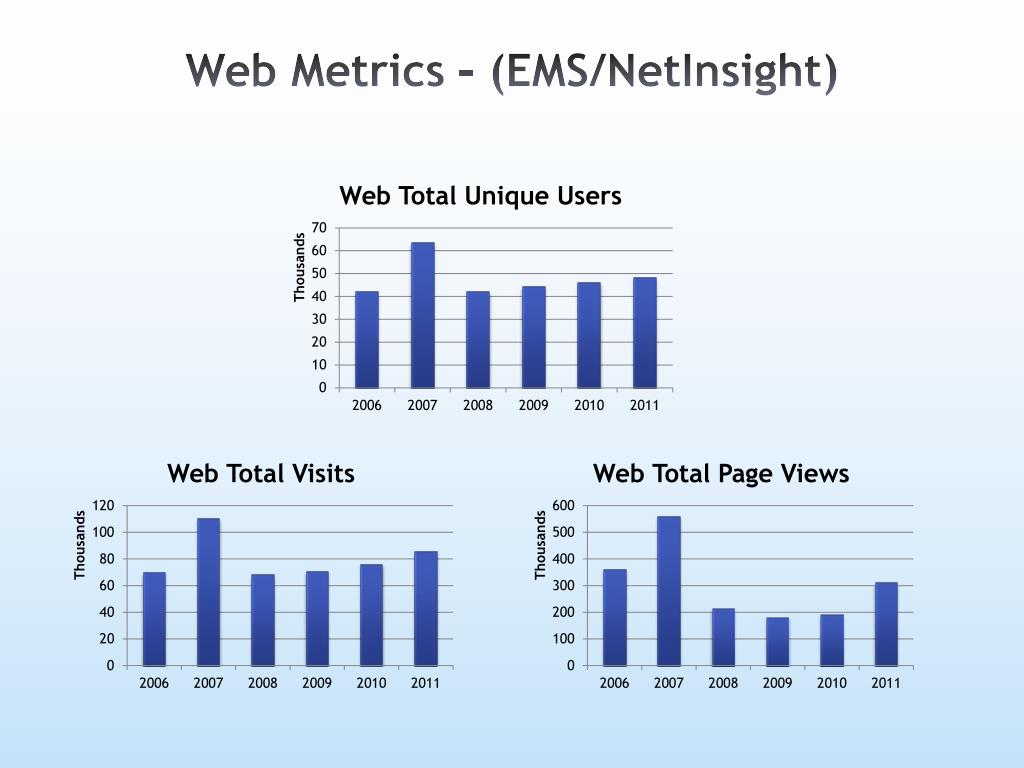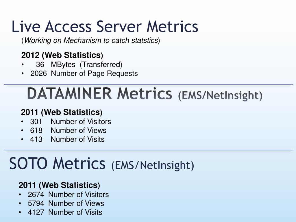 DATAMINER Metrics (EMS/NetInsight) Live Access Server Metrics • (Working on Mechanism to catch statstics) • 2012 (Web Statistics) • 36 MBytes (Transferred) • 2026 Number of Page Requests • 2011 (Web Statistics) • 301 Number of Visitors • 618 Number of Views • 413Number of Visits SOTO Metrics (EMS/NetInsight) • 2011 (Web Statistics) • 2674 Number of Visitors • 5794 Number of Views • 4127 Number of Visits