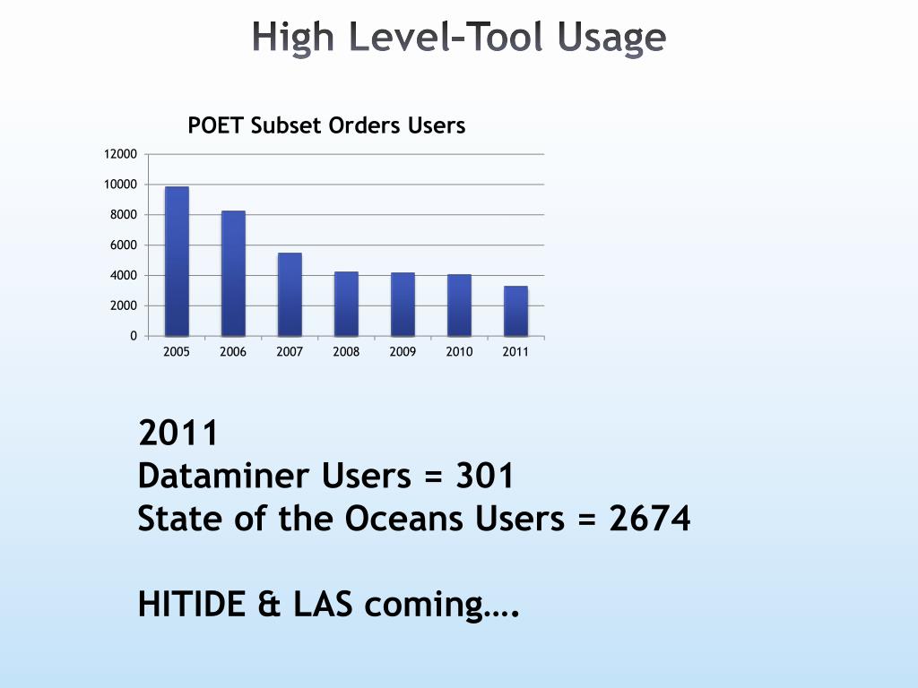 High Level–Tool Usage 2011 Dataminer Users = 301 State of the Oceans Users = 2674 HITIDE & LAS coming….
