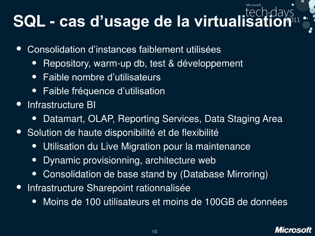 SQL - cas d’usage de la virtualisation • Consolidation d’instances faiblement utilisées • Repository, warm-up db, test & développement • Faible nombre d’utilisateurs • Faible fréquence d’utilisation • Infrastructure BI • Datamart, OLAP, Reporting Services, Data Staging Area • Solution de haute disponibilité et de flexibilité • Utilisation du Live Migration pour la maintenance • Dynamic provisionning, architecture web • Consolidation de base stand by (Database Mirroring) • Infrastructure Sharepoint rationnalisée • Moins de 100 utilisateurs et moins de 100GB de données