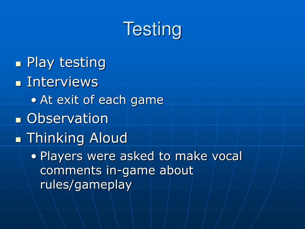 Testing • Play testing • Interviews • At exit of each game • Observation • Thinking Aloud • Players were asked to make vocal comments in-game about rules/gameplay