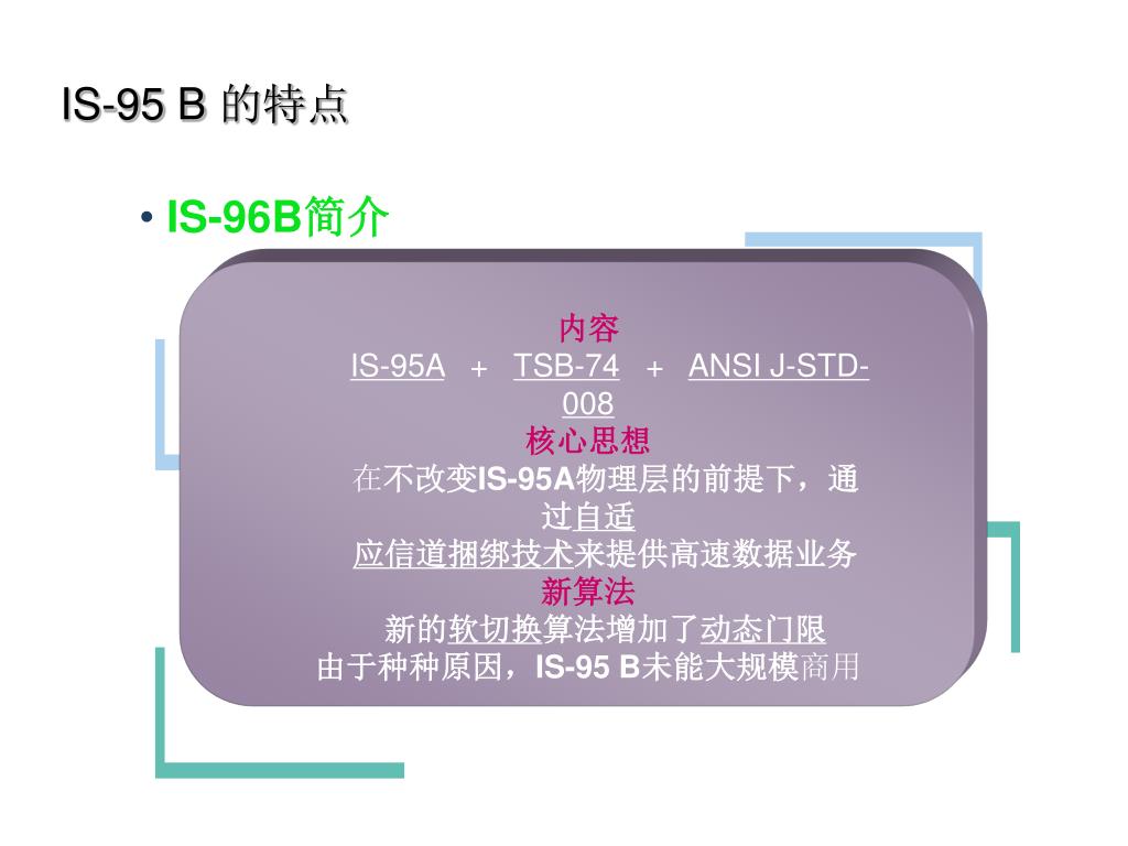 标 准 制定时间 说 明 ANSI J-STD-008 1995年 属于个人通信系统的CDMA标准 TSB-74 1995年 用于描述IS-95A系统和PCS系统相互间的交互关系 IS-95B 1998年 又称为TIA/EIA-95 IS-95 B的产生 需求 较高速率数据业务 新标准