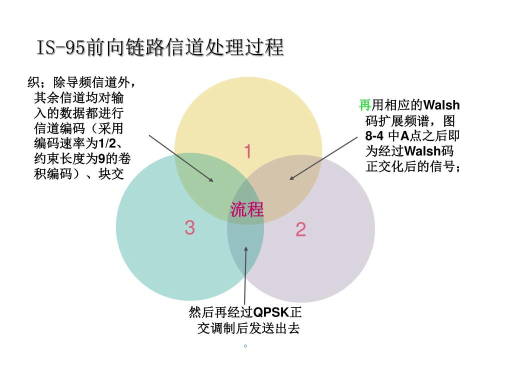 IS-95前向链路信道处理过程 织;除导频信道外,其余信道均对输入的数据都进行信道编码(采用编码速率为1/2、约束长度为9的卷积编码)、块交 1 再用相应的Walsh码扩展频谱,图8-4 中A点之后即为经过Walsh码正交化后的信号; 3 2 流程 然后再经过QPSK正交调制后发送出去。