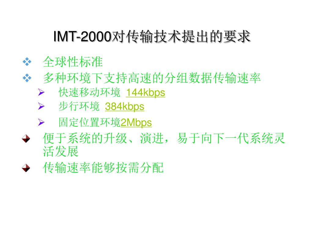 IMT-2000对传输技术提出的要求 • 全球性标准 • 多种环境下支持高速的分组数据传输速率 • 快速移动环境144kbps • 步行环境384kbps • 固定位置环境2Mbps • 便于系统的升级、演进,易于向下一代系统灵活发展 • 传输速率能够按需分配