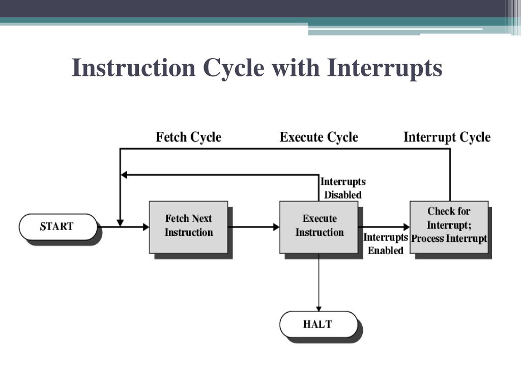 Interrupt Cycle • Added to instruction cycle. • Processor checks for interrupt. • Indicated by an interrupt signal. • If no interrupt, fetch next instruction. • If interrupt pending: • Suspend execution of current program • Save context • Set PC to start address of interrupt handler routine • Process interrupt • Restore context and continue interrupted program