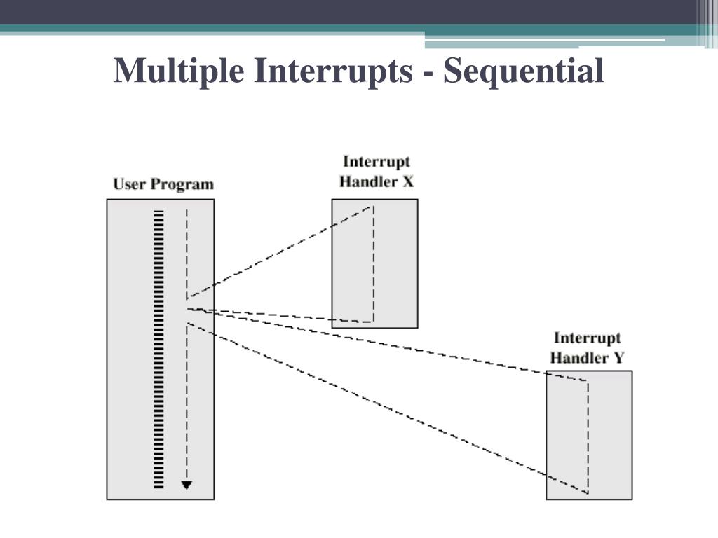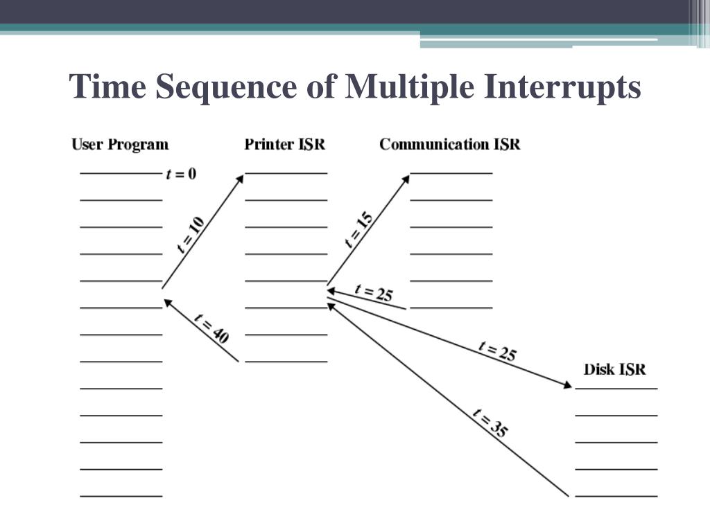 Multiple Interrupts • Disable interrupts • Processor will ignore further interrupts whilst processing one interrupt • Interrupts remain pending and are checked after first interrupt has been processed • Interrupts handled in sequence as they occur • Define priorities • Low priority interrupts can be interrupted by higher priority interrupts • When higher priority interrupt has been processed, processor returns to previous interrupt