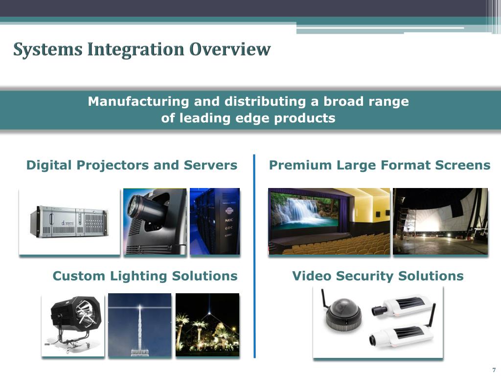 Systems Integration Overview Manufacturing and distributing a broad range of leading edge products Digital Projectors and Servers Premium Large Format Screens Custom Lighting Solutions Video Security Solutions Insert Pictures 7