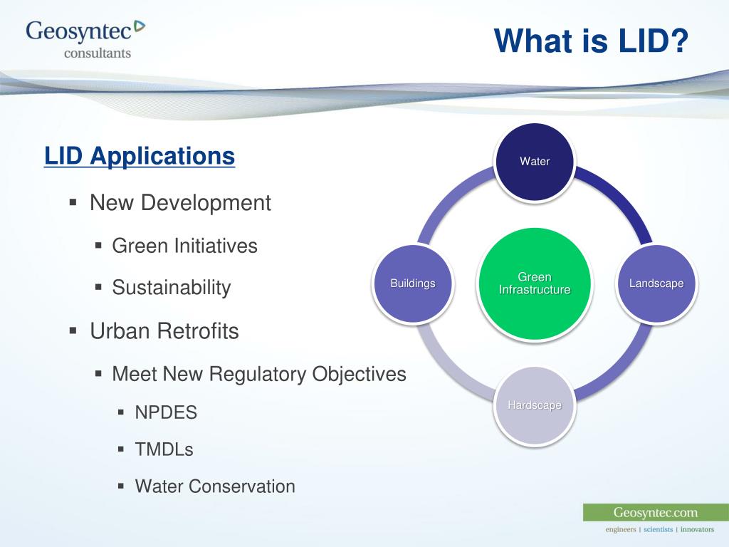 What is LID? LID Applications • New Development • Green Initiatives • Sustainability • Urban Retrofits • Meet New Regulatory Objectives • NPDES • TMDLs • Water Conservation