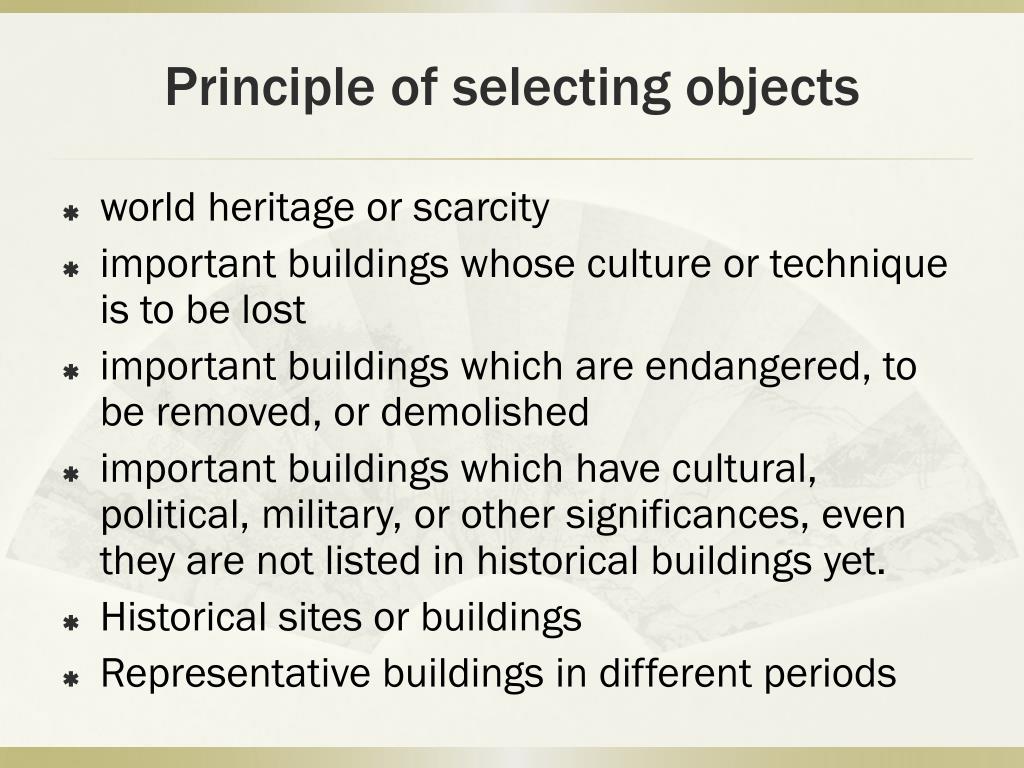 Principle of selecting objects • world heritage or scarcity • important buildings whose culture or technique is to be lost • important buildings which are endangered, to be removed, or demolished • important buildings which have cultural, political, military, or other significances, even they are not listed in historical buildings yet. • Historical sites or buildings • Representative buildings in different periods