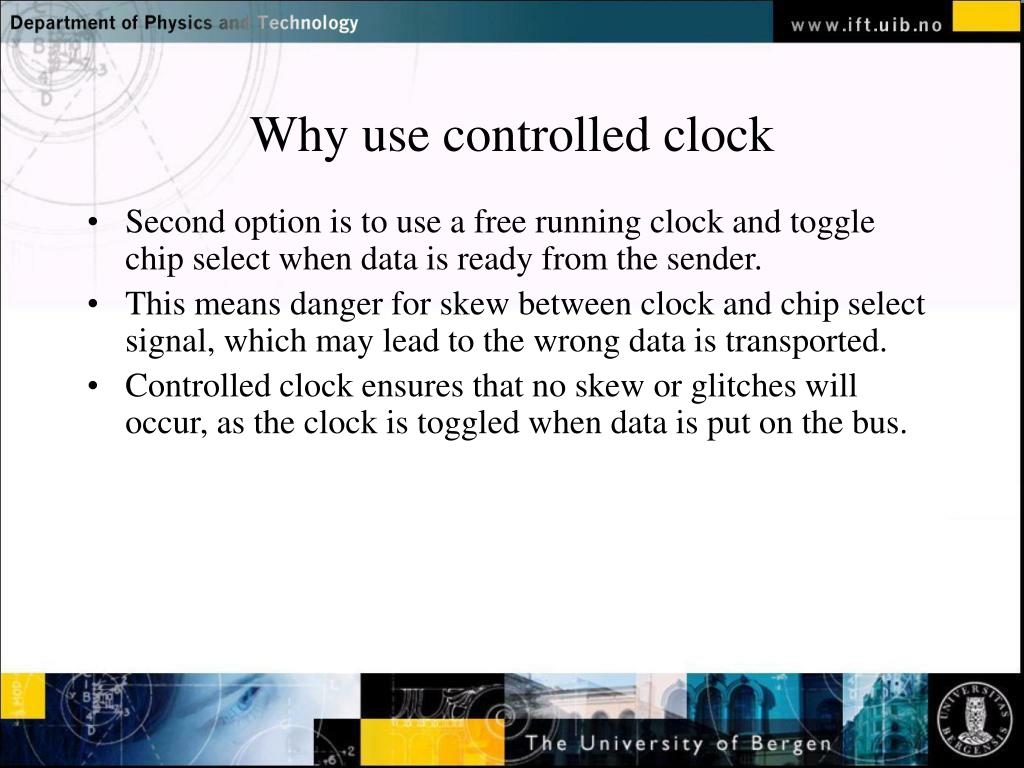 Why use controlled clock • Second option is to use a free running clock and toggle chip select when data is ready from the sender. • This means danger for skew between clock and chip select signal, which may lead to the wrong data is transported. • Controlled clock ensures that no skew or glitches will occur, as the clock is toggled when data is put on the bus.