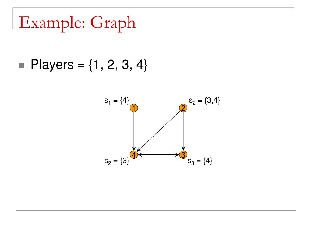 Example: Graph • Players = {1, 2, 3, 4} s1 = {4} s2 = {3,4} 1 2 4 3 s2 = {3} s3 = {4}