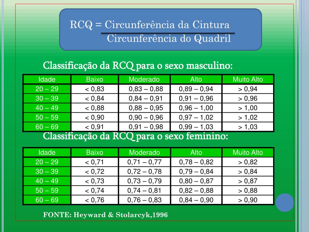 RCQ = Circunferência da Cintura Circunferência do Quadril Classificação da RCQ para o sexo masculino: Classificação da RCQ para o sexo feminino: FONTE: Heyward & Stolarcyk,1996