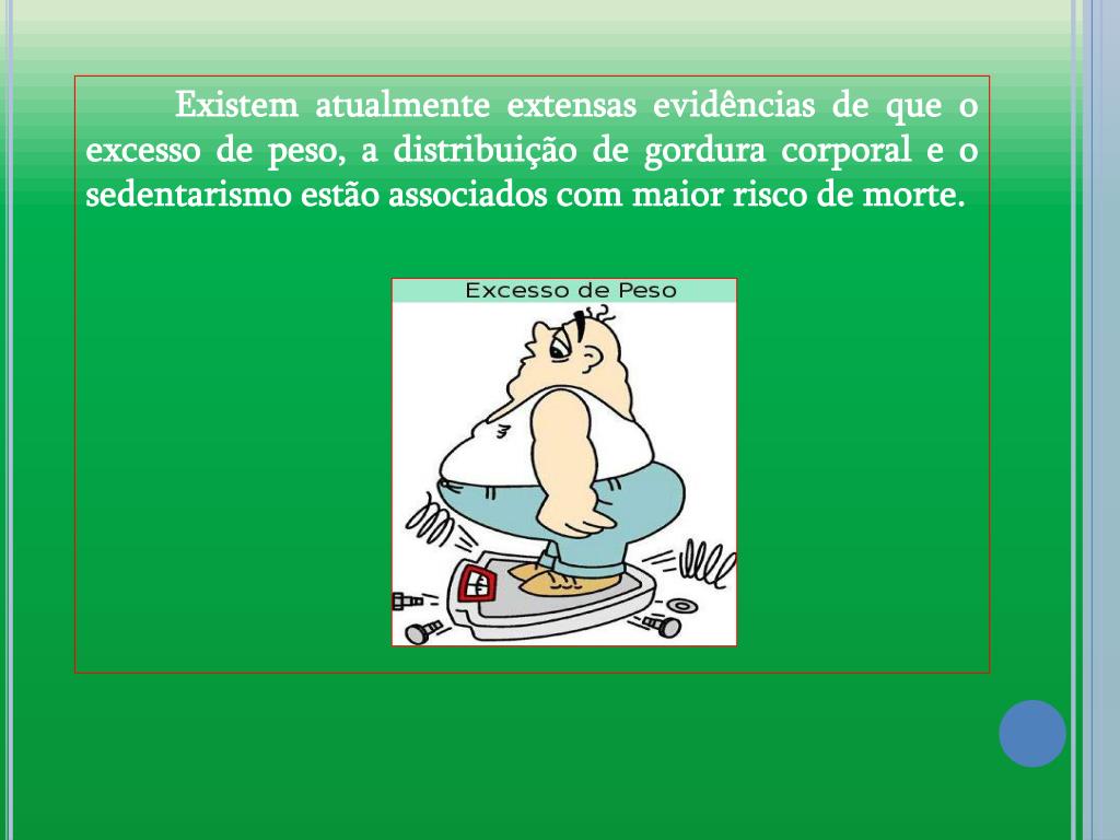 Existem atualmente extensas evidências de que o excesso de peso, a distribuição de gordura corporal e o sedentarismo estão associados com maior risco de morte.