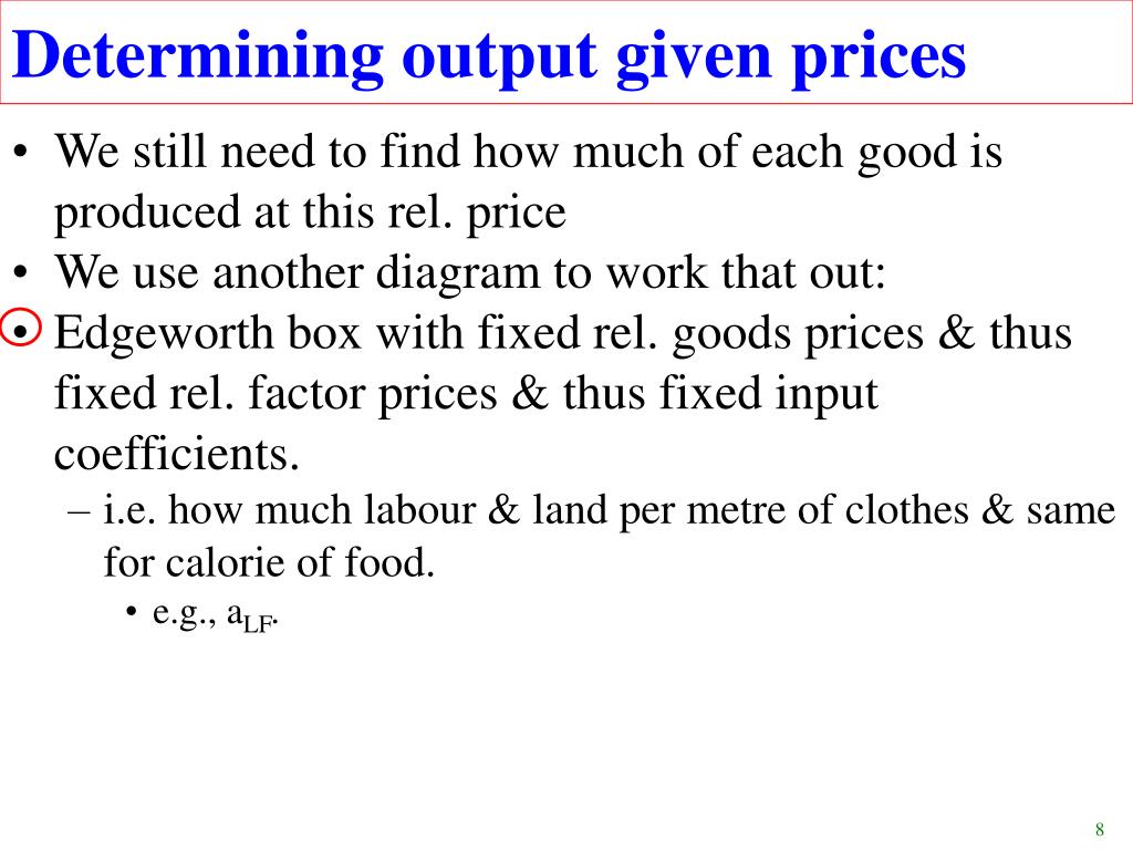 Determining output given prices • We still need to find how much of each good is produced at this rel. price • We use another diagram to work that out: • Edgeworth box with fixed rel. goods prices & thus fixed rel. factor prices & thus fixed input coefficients. • i.e. how much labour & land per metre of clothes & same for calorie of food. • e.g., aLF.