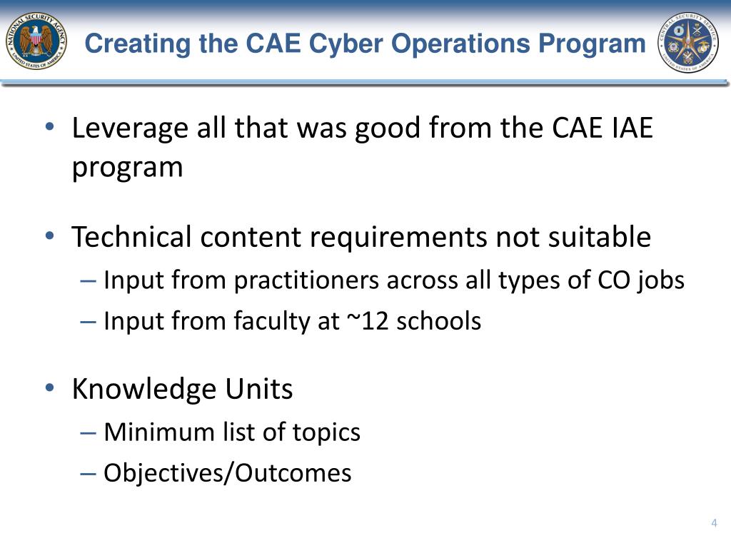 Creating the CAE Cyber Operations Program • Leverage all that was good from the CAE IAE program • Technical content requirements not suitable • Input from practitioners across all types of CO jobs • Input from faculty at ~12 schools • Knowledge Units • Minimum list of topics • Objectives/Outcomes