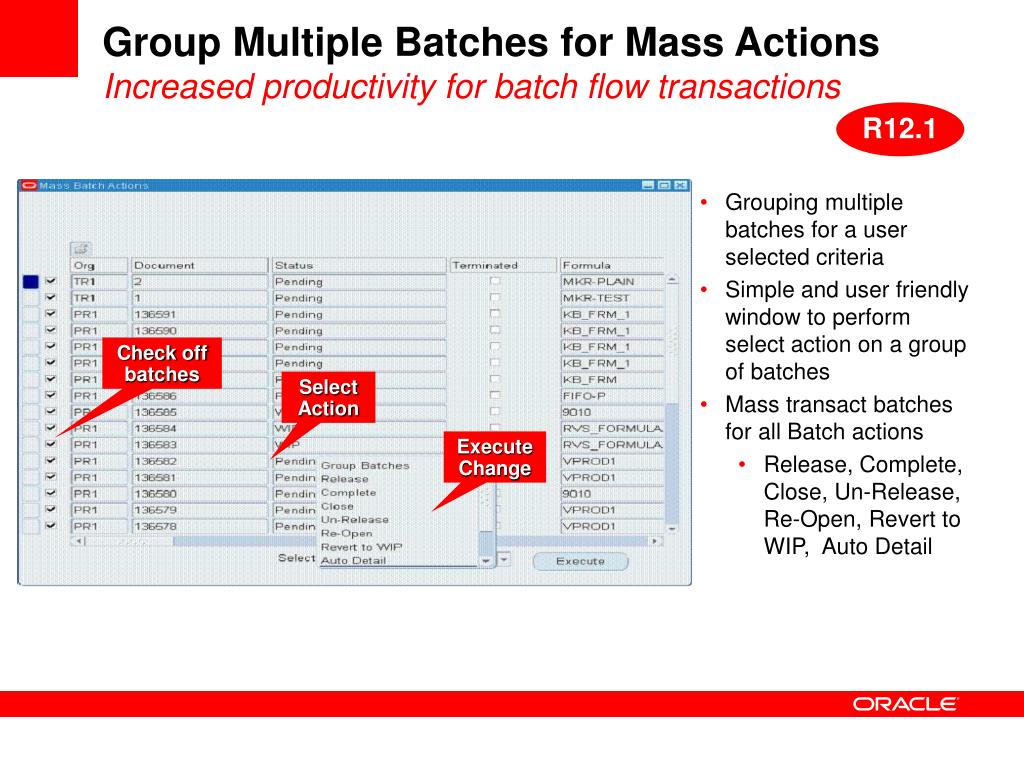 Group Multiple Batches for Mass ActionsIncreased productivity for batch flow transactions Grouping multiple batches for a user selected criteria Simple and user friendly window to perform select action on a group of batches Mass transact batches for all Batch actions Release, Complete, Close, Un-Release, Re-Open, Revert to WIP, Auto Detail R12.1 Check off batches Select Action Execute Change