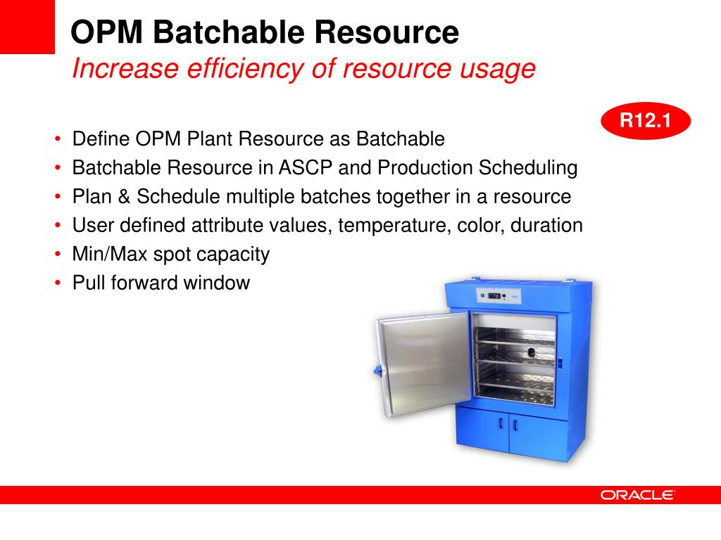 OPM Batchable Resource Increase efficiency of resource usage Define OPM Plant Resource as Batchable Batchable Resource in ASCP and Production Scheduling Plan & Schedule multiple batches together in a resource User defined attribute values, temperature, color, duration Min/Max spot capacity Pull forward window R12.1