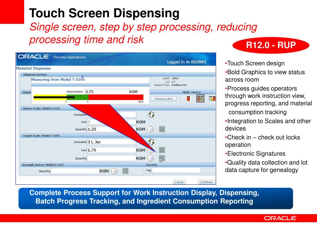 Touch Screen Dispensing Single screen, step by step processing, reducing processing time and risk R12.0 - RUP • Touch Screen design • Bold Graphics to view status across room • Process guides operators through work instruction view, progress reporting, and material • consumption tracking • Integration to Scales and other devices • Check in – check out locks operation • Electronic Signatures • Quality data collection and lot data capture for genealogy Complete Process Support for Work Instruction Display, Dispensing, Batch Progress Tracking, and Ingredient Consumption Reporting