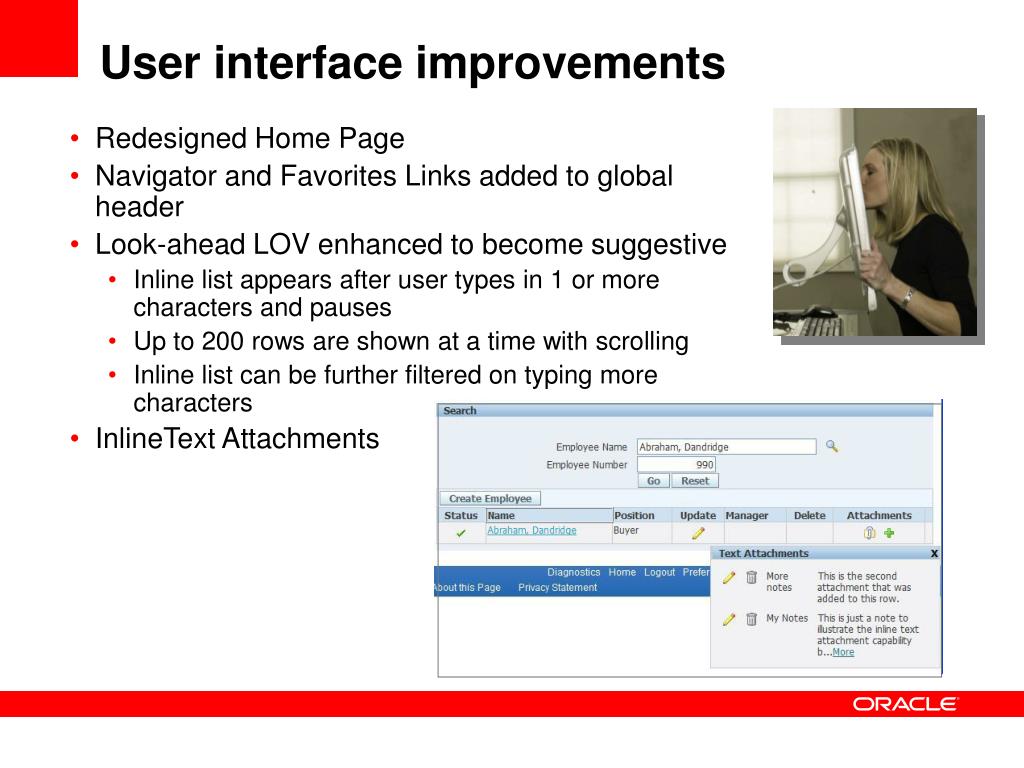 User interface improvements • Redesigned Home Page • Navigator and Favorites Links added to global header • Look-ahead LOV enhanced to become suggestive • Inline list appears after user types in 1 or more characters and pauses • Up to 200 rows are shown at a time with scrolling • Inline list can be further filtered on typing more characters • InlineText Attachments