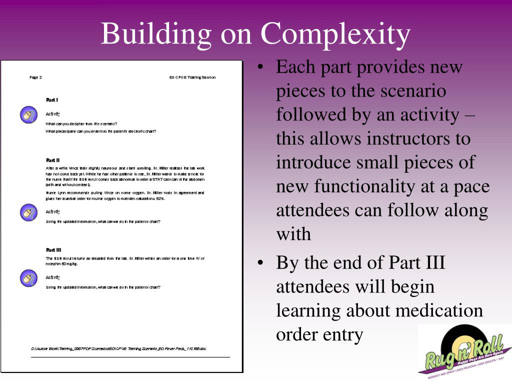 Building on Complexity • Each part provides new pieces to the scenario followed by an activity – this allows instructors to introduce small pieces of new functionality at a pace attendees can follow along with • By the end of Part III attendees will begin learning about medication order entry