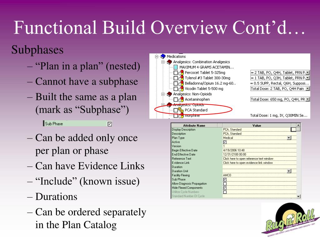 Functional Build Overview Cont’d… Subphases • “Plan in a plan” (nested) • Cannot have a subphase • Built the same as a plan (mark as “Subphase”) • Can be added only once per plan or phase • Can have Evidence Links • “Include” (known issue) • Durations • Can be ordered separately in the Plan Catalog