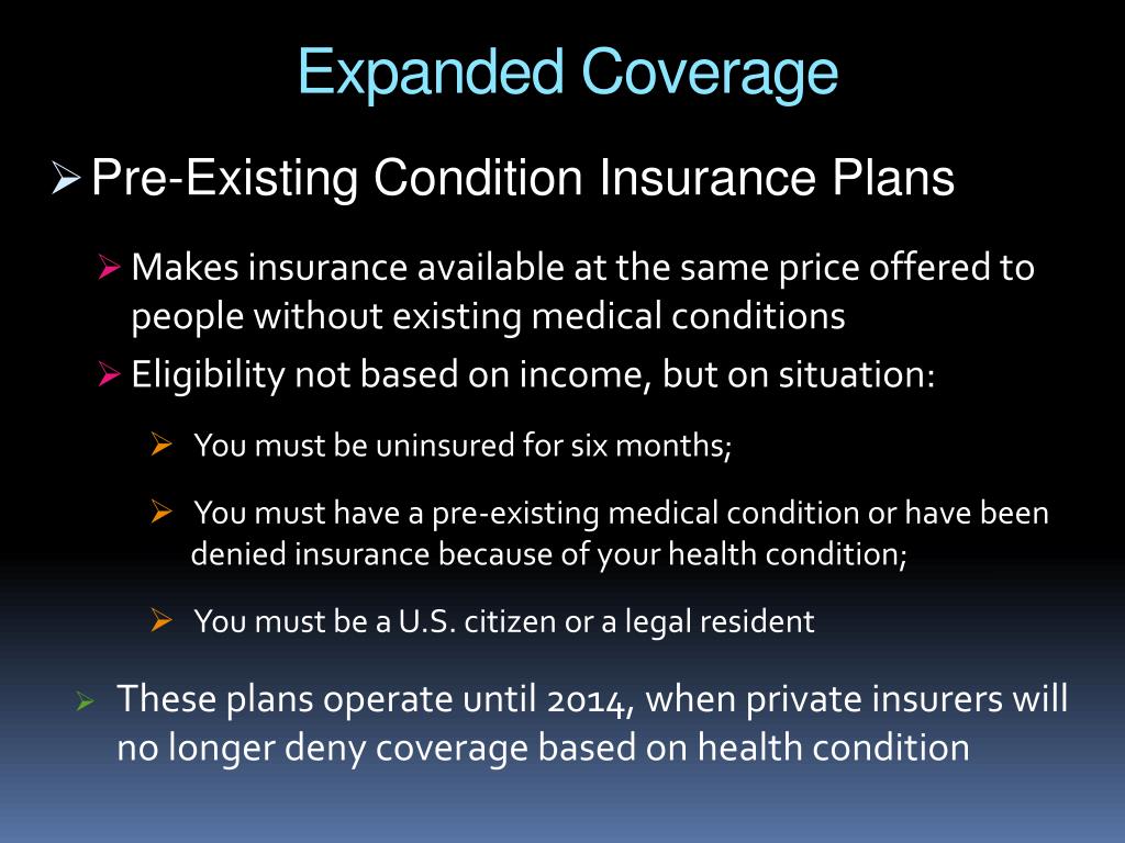 Expanded Coverage • Pre-Existing Condition Insurance Plans • Makes insurance available at the same price offered to people without existing medical conditions • Eligibility not based on income, but on situation: • You must be uninsured for six months; • You must have a pre-existing medical condition or have been denied insurance because of your health condition; • You must be a U.S. citizen or a legal resident • These plans operate until 2014, when private insurers will no longer deny coverage based on health condition