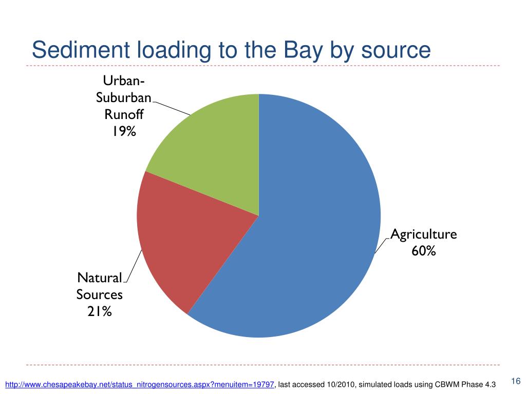 Sediment loading to the Bay by source http://www.chesapeakebay.net/status_nitrogensources.aspx?menuitem=19797, last accessed 10/2010, simulated loads using CBWM Phase 4.3