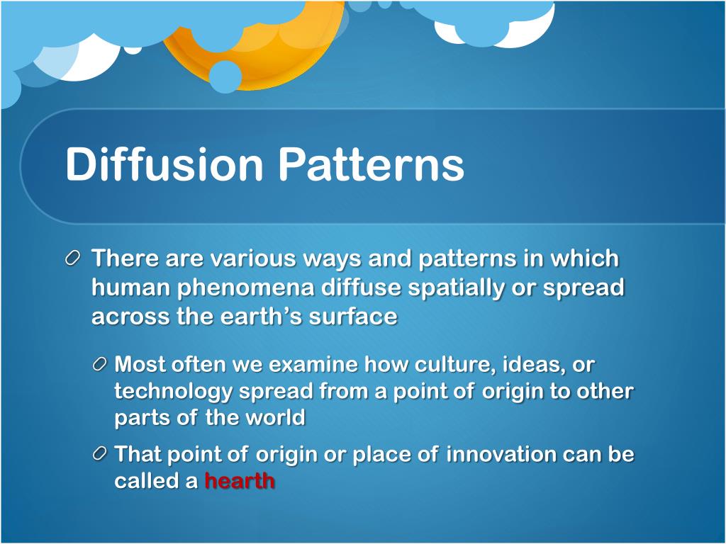 Diffusion Patterns • There are various ways and patterns in which human phenomena diffuse spatially or spread across the earth’s surface • Most often we examine how culture, ideas, or technology spread from a point of origin to other parts of the world • That point of origin or place of innovation can be called a hearth