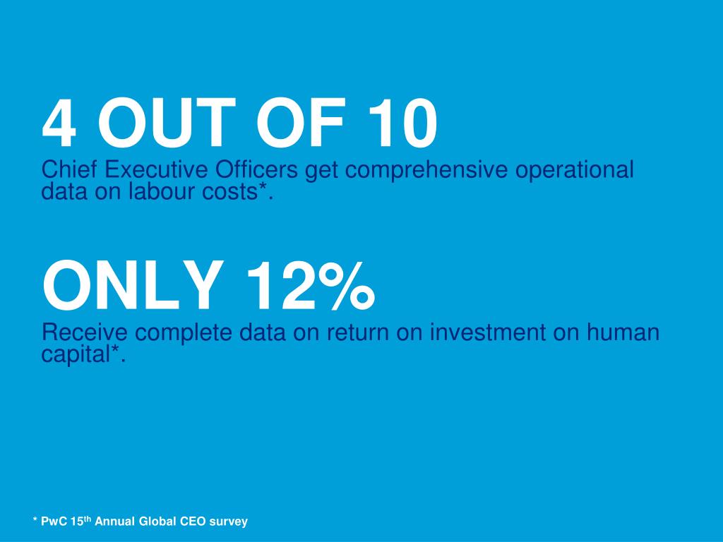 4 OUT OF 10 Chief Executive Officers get comprehensive operational data on labour costs*.ONLY 12%Receive complete data on return on investment on human capital*. • * PwC 15th Annual Global CEO survey Presenter's name & Date. 2003 users: Go View Header & Footer to edit text / 2007 users: Go Insert Header & Footer to edit text