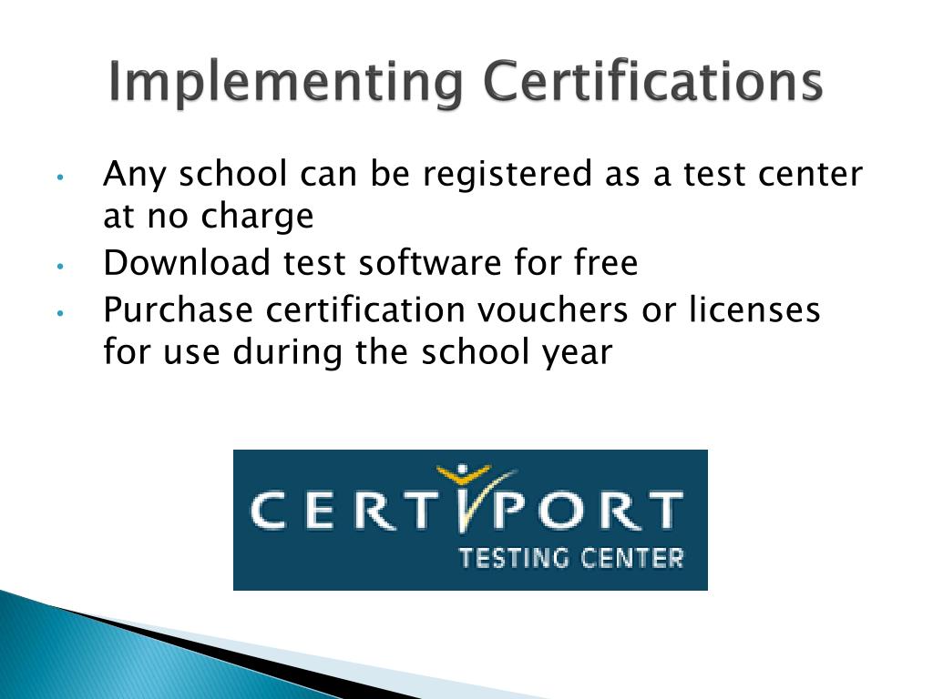 Implementing Certifications • Any school can be registered as a test center at no charge • Download test software for free • Purchase certification vouchers or licenses for use during the school year