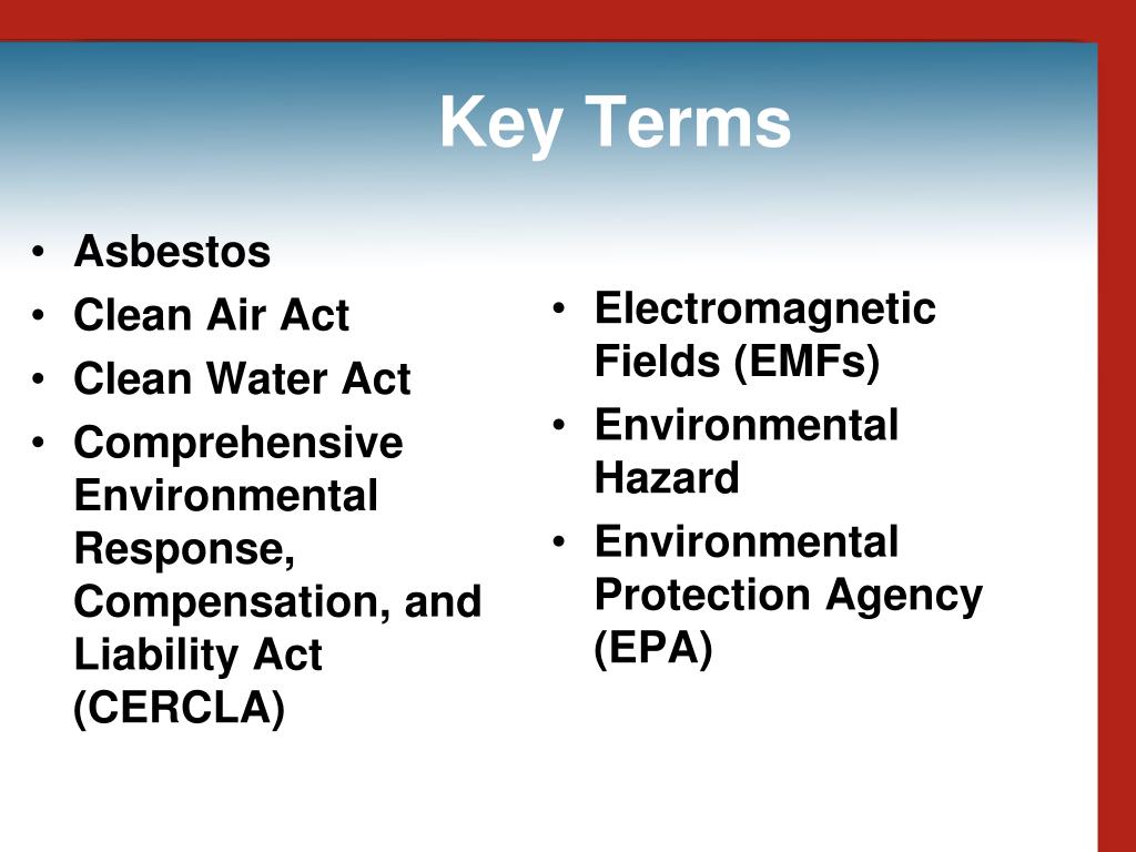 Asbestos Clean Air Act Clean Water Act Comprehensive Environmental Response, Compensation, and Liability Act (CERCLA) Electromagnetic Fields (EMFs) Environmental Hazard Environmental Protection Agency (EPA) Key Terms