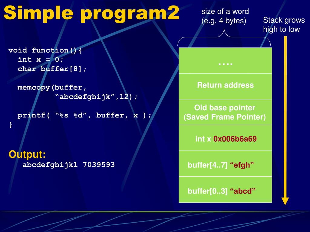 size of a word (e.g. 4 bytes) Stack grows high to low Simple program2 void function(){ int x = 0; char buffer[8]; memcopy(buffer, “abcdefghijk”,12); printf( “%s %d”, buffer, x ); } Output: abcdefghijkl 7039593 …. Return address Old base pointer (Saved Frame Pointer) int x 0x006b6a69 buffer[4..7] “efgh” buffer[0..3] “abcd”