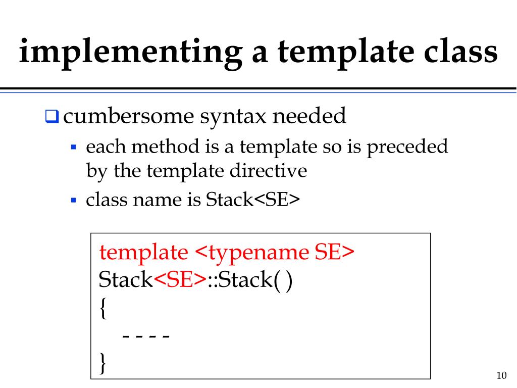 implementing a template class • cumbersome syntax needed • each method is a template so is preceded by the template directive • class name is Stack<SE> template <typename SE> Stack<SE>::Stack( ) { - - - - }