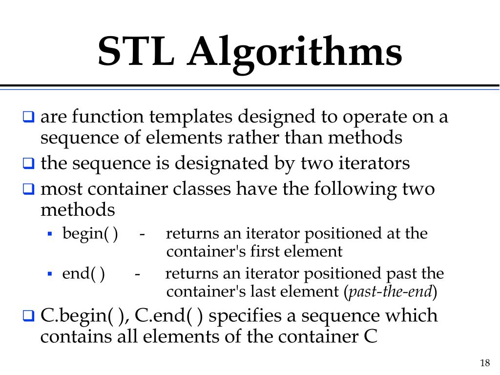 STL Algorithms • are function templates designed to operate on a sequence of elements rather than methods • the sequence is designated by two iterators • most container classes have the following two methods • begin( ) - returns an iterator positioned at the container's first element • end( ) - returns an iterator positioned past the container's last element (past-the-end) • C.begin( ), C.end( ) specifies a sequence which contains all elements of the container C