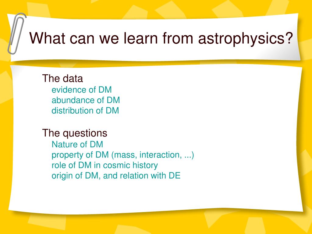 What can we learn from astrophysics? The data evidence of DM abundance of DM distribution of DM The questions Nature of DM property of DM (mass, interaction, ...) role of DM in cosmic history origin of DM, and relation with DE