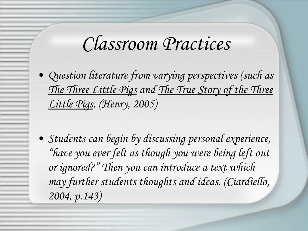 Classroom Practices • Question literature from varying perspectives (such as The Three Little Pigs and The True Story of the Three Little Pigs. (Henry, 2005) • Students can begin by discussing personal experience, “have you ever felt as though you were being left out or ignored?” Then you can introduce a text which may further students thoughts and ideas. (Ciardiello, 2004, p.143)