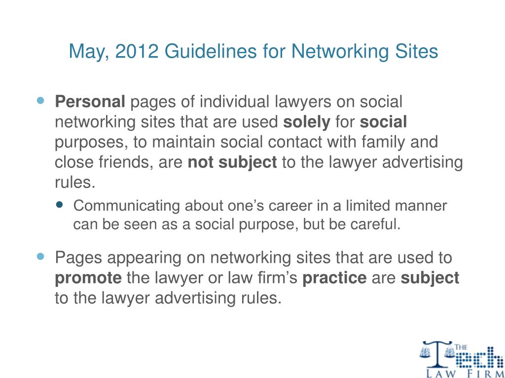 May, 2012 Guidelines for Networking Sites • Personal pages of individual lawyers on social networking sites that are used solely for social purposes, to maintain social contact with family and close friends, are not subject to the lawyer advertising rules. • Communicating about one’s career in a limited manner can be seen as a social purpose, but be careful. • Pages appearing on networking sites that are used to promote the lawyer or law firm’s practice are subject to the lawyer advertising rules.