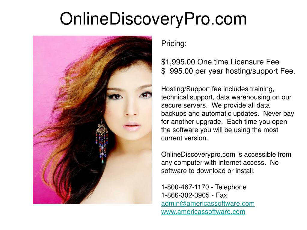 OnlineDiscoveryPro.com Pricing: $1,995.00 One time Licensure Fee $ 995.00 per year hosting/support Fee. Hosting/Support fee includes training, technical support, data warehousing on our secure servers. We provide all data backups and automatic updates. Never pay for another upgrade. Each time you open the software you will be using the most current version. OnlineDiscoverypro.com is accessible from any computer with internet access. No software to download or install. 1-800-467-1170 - Telephone 1-866-302-3905 - Fax admin@americassoftware.com www.americassoftware.com