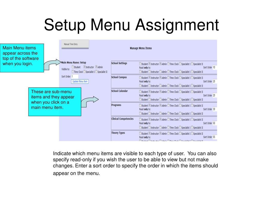 Setup Menu Assignment Main Menu items appear across the top of the software when you login. These are sub-menu items and they appear when you click on a main menu item. Indicate which menu items are visible to each type of user. You can also specify read-only if you wish the user to be able to view but not make changes. Enter a sort order to specify the order in which the items should appear on the menu.