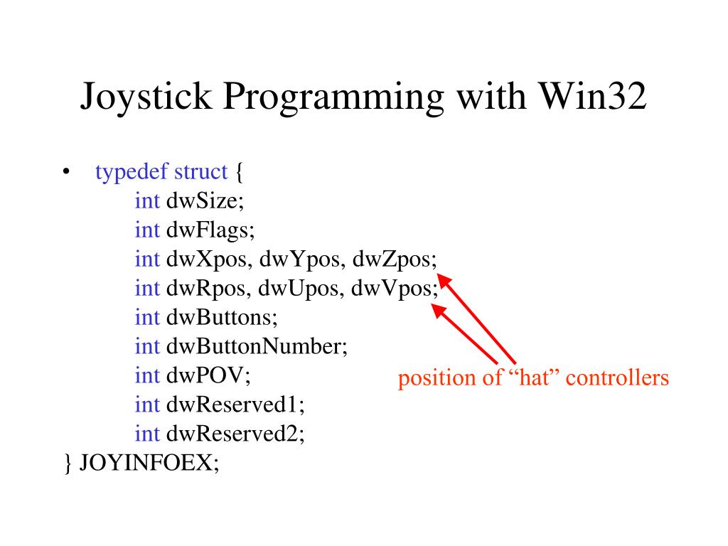 Joystick Programming with Win32 • typedefstruct { int dwSize; int dwFlags; int dwXpos, dwYpos, dwZpos; int dwRpos, dwUpos, dwVpos; int dwButtons; int dwButtonNumber; int dwPOV; int dwReserved1; int dwReserved2; } JOYINFOEX; MUST be sizeof( JOYINFOEX)