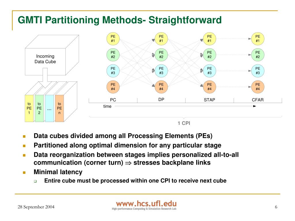 GMTI Partitioning Methods- Straightforward • Data cubes divided among all Processing Elements (PEs) • Partitioned along optimal dimension for any particular stage • Data reorganization between stages implies personalized all-to-all communication (corner turn) stresses backplane links • Minimal latency • Entire cube must be processed within one CPI to receive next cube